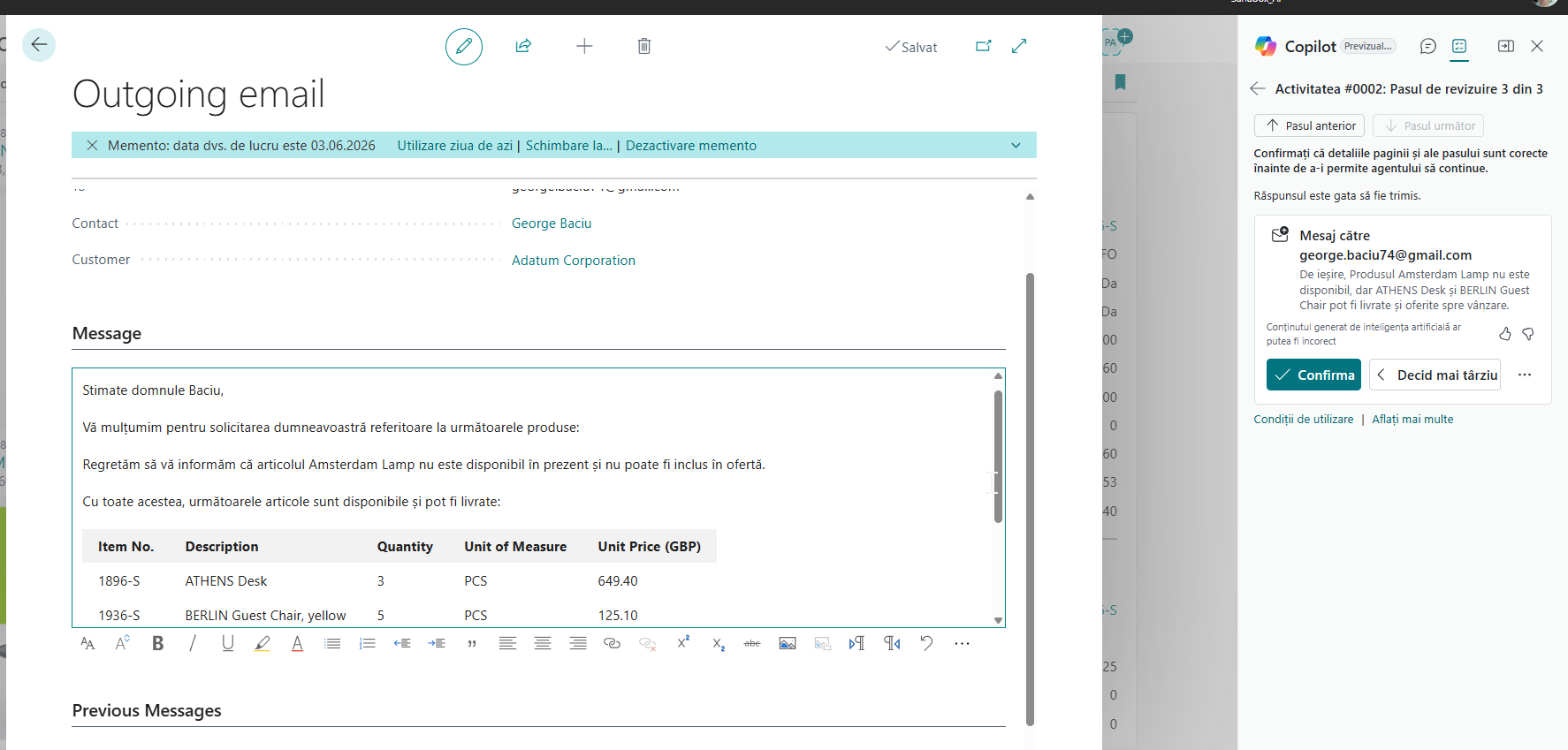 În Business Central, agentul AI de vânzări va identifica acest mesaj ca fiind o cerere de ofertă.